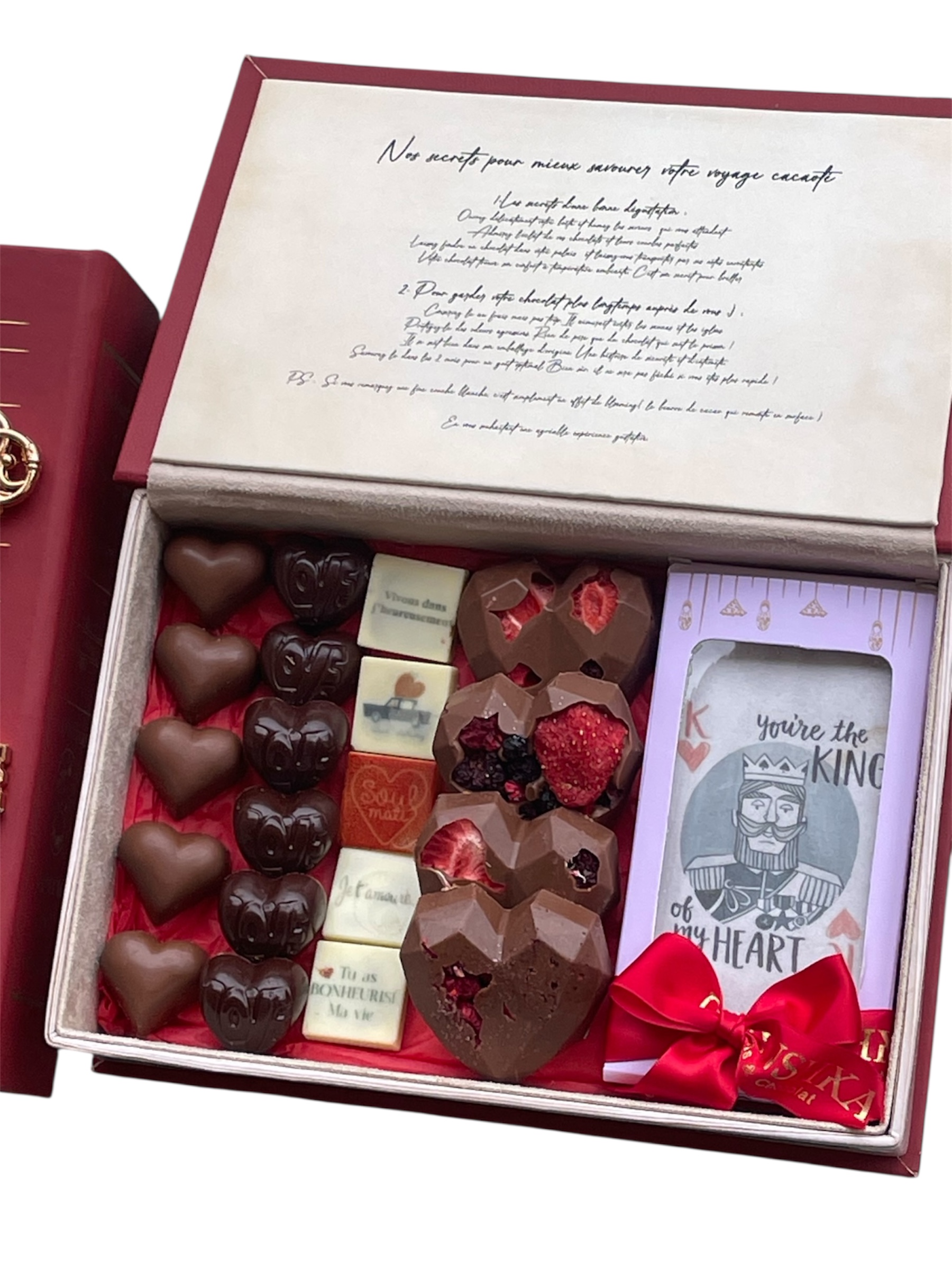 Coffret Bouquin pour Lui, composé d’une tablette de chocolat de 100g, et de 365g de chocolat sous forme de cœurs dans des saveurs croustillantes et fruitées.