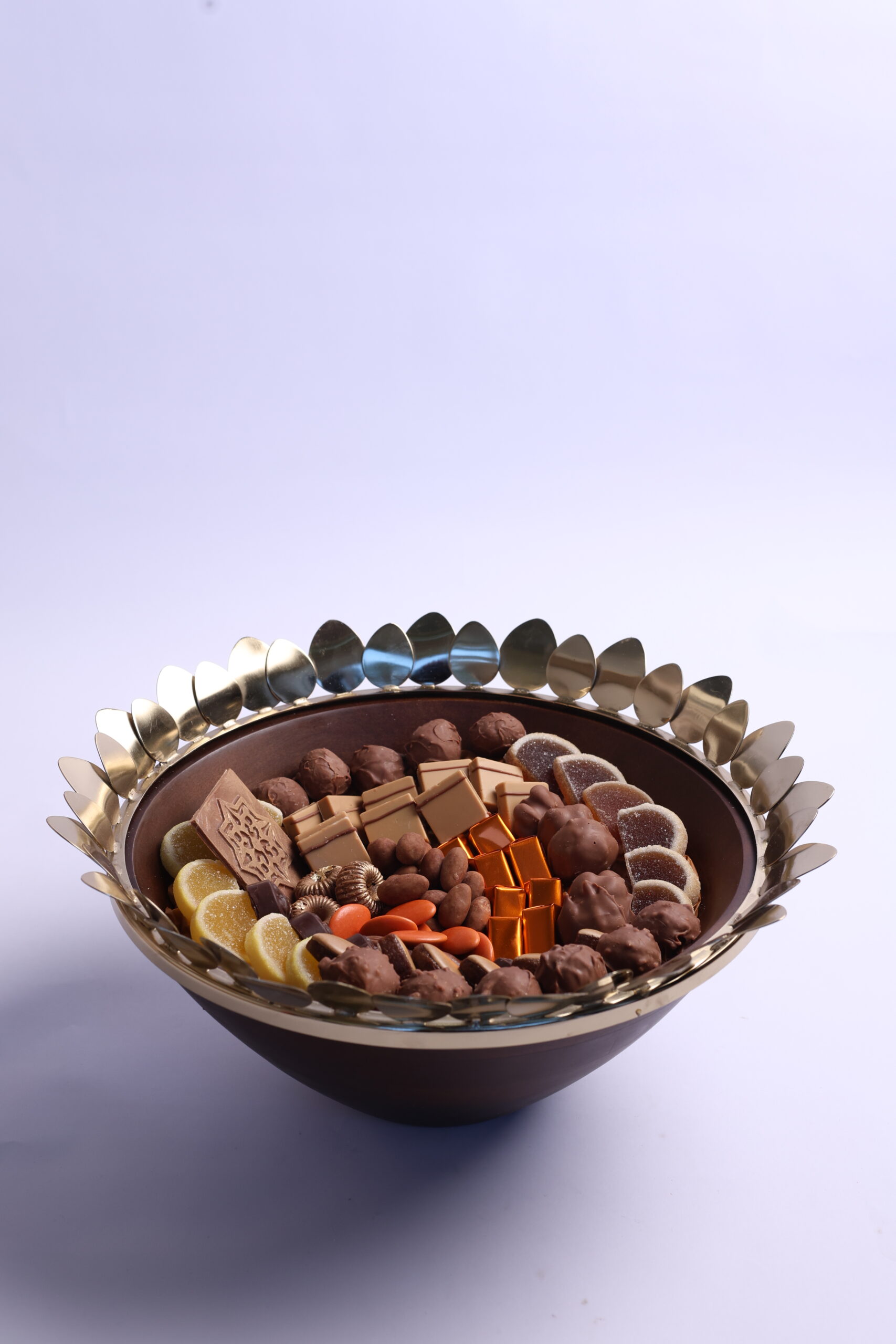 Coupe en bois sous forme d’un panier de fruits, ornée de feuilles dorées.