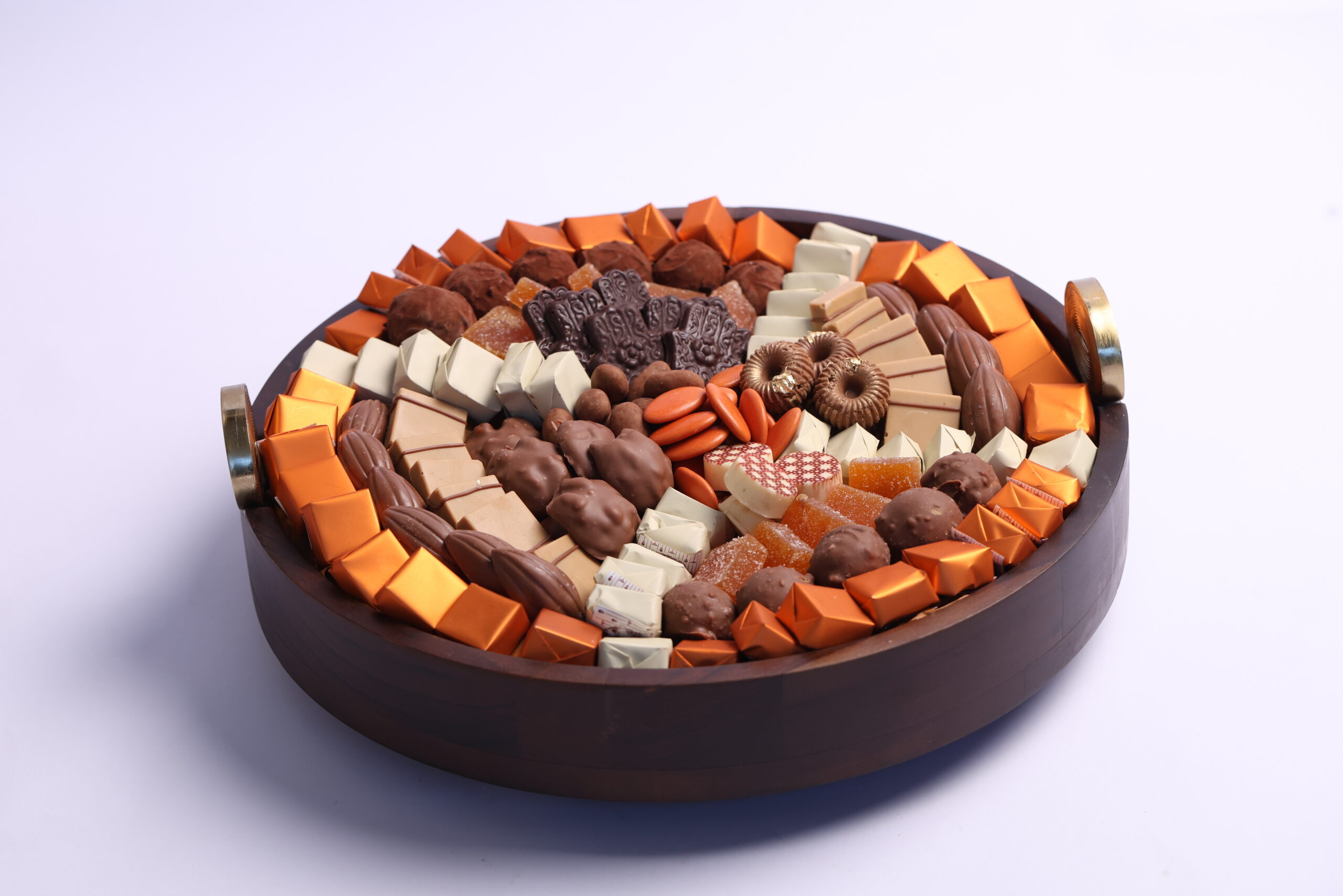 Composé de : 1kg 500g de chocolats et confiserie, qui font rappel aux couleurs des orangers du Maroc.