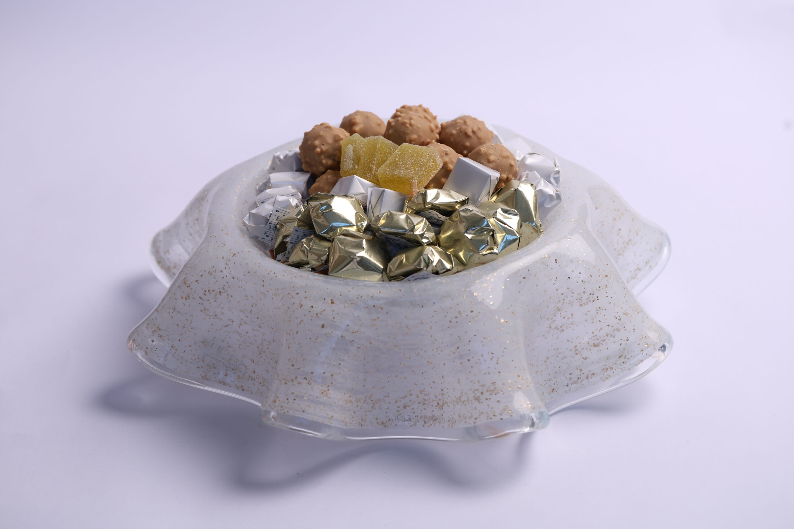 Coupe Murano véritable pailletée en or, garnie de 1kg de chocolats et confiserie.