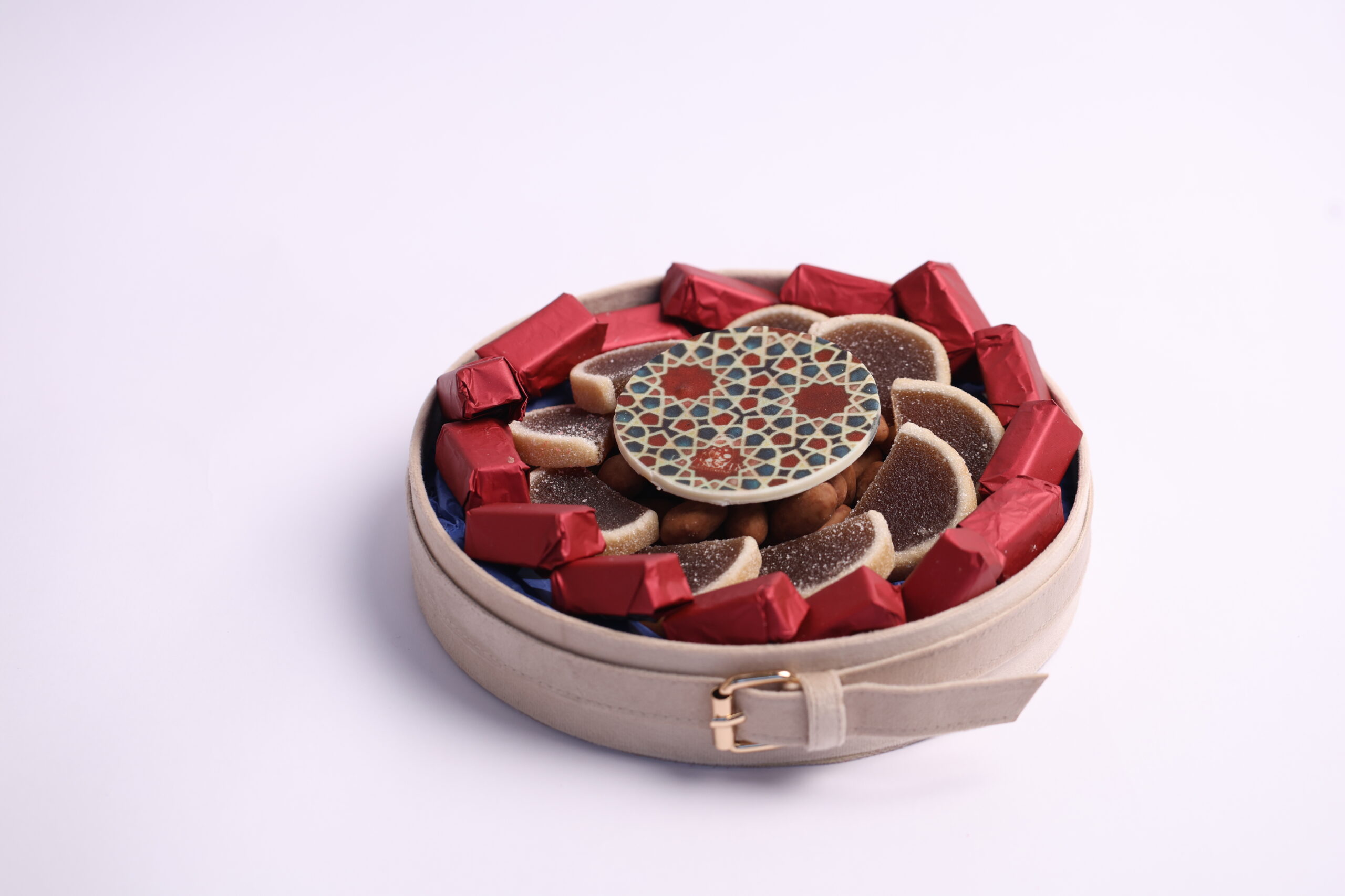 Plateau vide-poche en faux daim. Composé de 500g de chocolats,