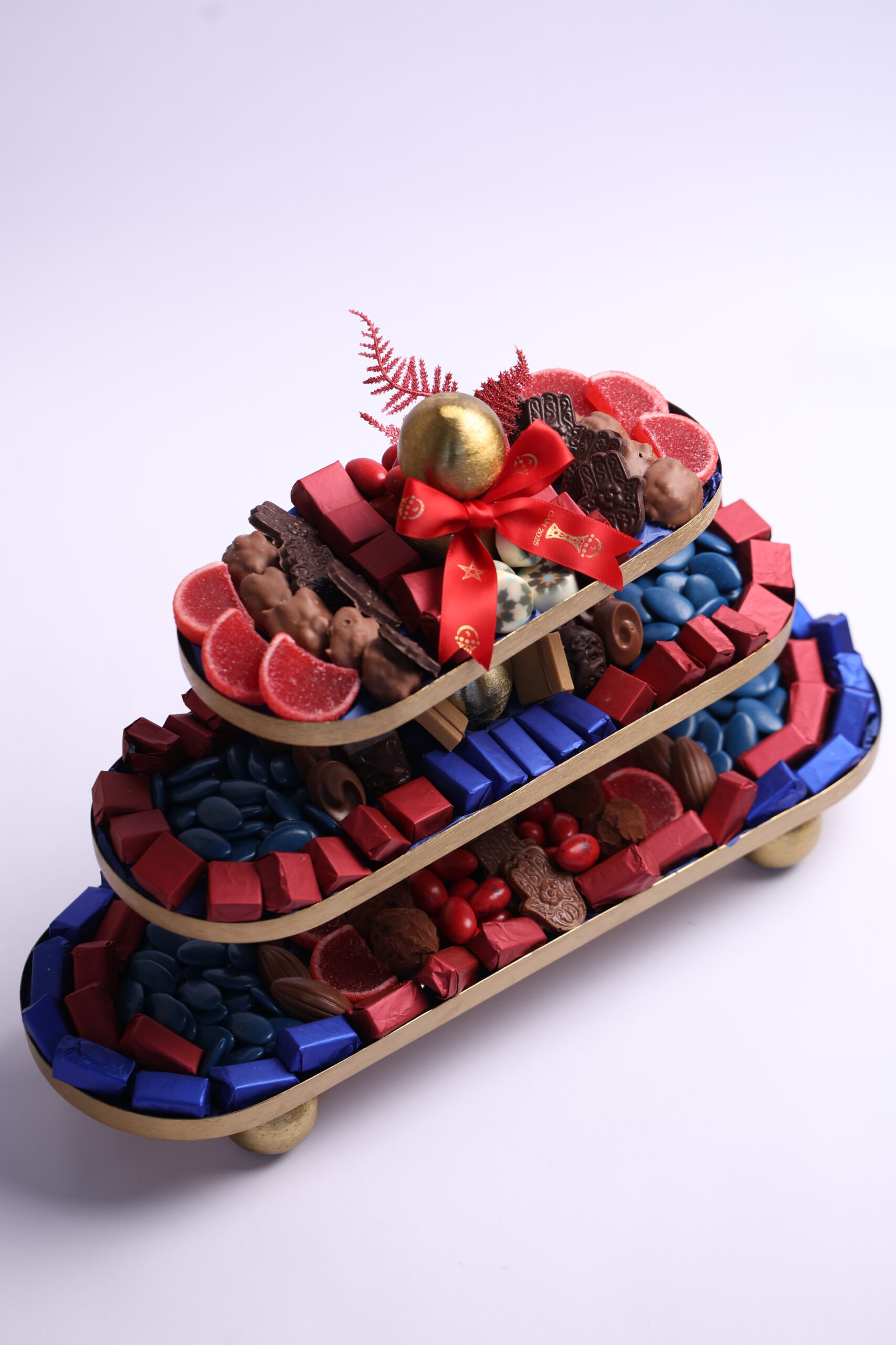 Serviteur métallique trois niveaux; composé de : 2,5kg de chocolats et confiserie,